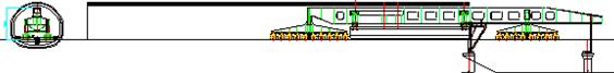 3、操作系統由運輸狀態轉換至喂梁狀態,由后車及主支腿驅動裝置推動整機前行,當輔助支腿到達待架孔前方橋墩支承位置時停車。在箱梁下面放置臨時支墩,并將箱梁放在臨時支墩上,然后打好輔助支腿。