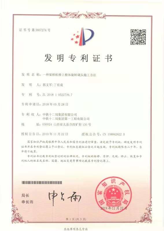 【發(fā)明專(zhuān)利證書(shū)】一種架橋機(jī)橋上整體旋轉(zhuǎn)調(diào)頭施工方法
